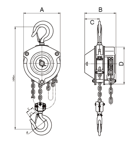 试验载荷[Ton] | 钩间最小距离[min] | 满载时手拉力[kg] | 起重链条挂数 | 载重链条规格[mm] |
