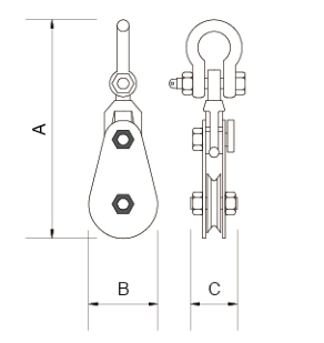 | 工厂编号 | 型号 | 额定载荷 [t] | 滑轮尺寸 [mm] | A1[mm] | B[mm] | C[mm] | 钢丝绳直径范围 [mm] | 净重 [kg] |