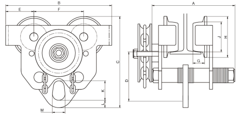 | 工厂编号 | 型号 | 额定载重量 [t] | 试验载荷 [t] | 工字钢轨宽适用范围A[mm] | 工字钢轨宽适用范围B [mm] |