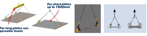 本水平吊钳与双腿型吊索配合使用,适用于长度小于1500mm的钢板,如吊运面积较大或较长的钢板时,我们建议使用吊梁。