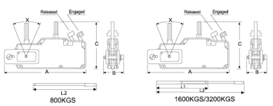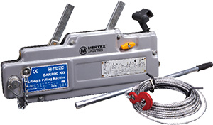 | 工厂编号 | 型号 | 额定起吊载荷[kg] | 额定拉升载荷[kg] | 牵引速度[mm] | 手扳力[N] | 钢丝绳直径[mm] | 钢丝绳长度[m] | A [mm] | B [mm] | C [mm] |